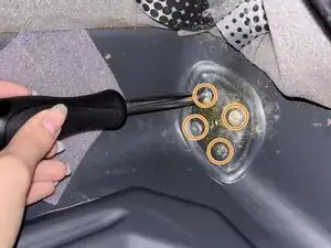Используйте крестовую отвертку #2, чтобы удалить четыре винта, крепящих поврежденное колесо.