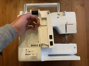 Осторожно разместите лишний изгиб жёлтого кабеля платы L обратно внутри корпуса швейной машины.