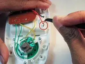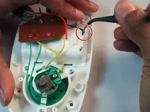 Пинцетом для мелких деталей отрежьте красный провод от металлического соединителя.