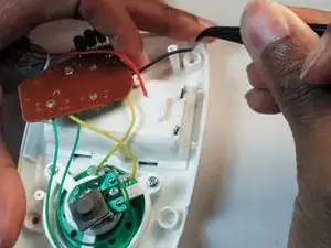 Пинцетом для мелких деталей отрежьте чёрный провод от металлического соединителя.