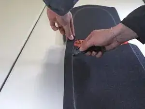 Следуя контуру деки, созданному при обработке краёв, обрежьте коврик на одном конце с помощью макетного ножа/канцелярского ножа.
