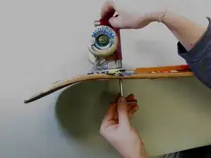 Используйте отвертку и скейт‑инструмент, чтобы окончательно затянуть гайки и болты траков к деке.