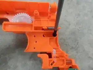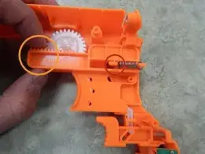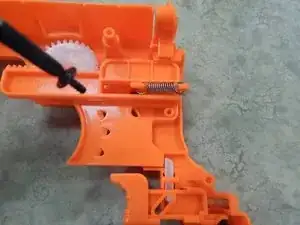 Найдите оранжевую планку, выступающую из остальной части пистолета. Вы увидите, что пружина зацеплена за два конца.
