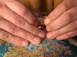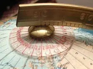 С пластиковым меридианом, как на этом, нужно немного приподнять меридиан от Северного полюса. Используйте пластиковое кольцо на северном полюсе, чтобы осторожно нажать на глобус вниз и приподнять меридиан, чтобы вытащить маленький штифт, удерживающий глобус.