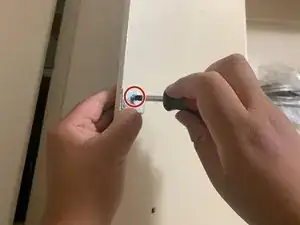 Вкрутите один винт 5 мм в новую магнитную планку с помощью крестовой отвёртки Phillips #0, чтобы закрепить её на одной стороне дверцы шкафа.