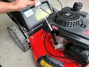 Отсоедините провод свечи зажигания, если будете наклонять газонокосилку для слива масла. [Он расположен спереди газонокосилки, слева от воздушного фильтра].