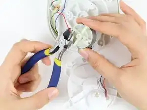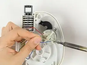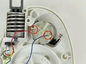 Выньте мотор из средней секции. С помощью бокорезов обрежьте красный и синий провода, находящиеся на задней части мотора.