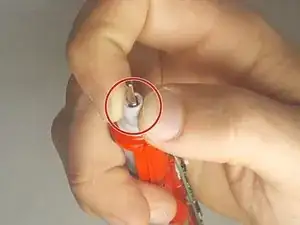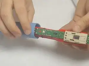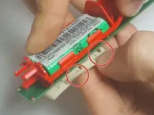 Удалите внутренний электронный механизм из корпуса, отжав красные зажимы, показанные на рисунке. Это удалит порт зарядки.