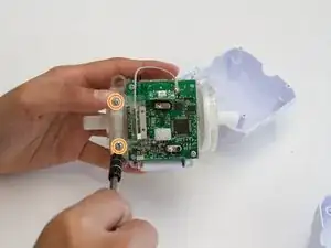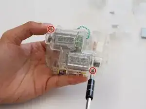 Ослабьте и снимите два винта 10 мм, удерживающие прозрачный корпус моторов, используя биту JIS #1