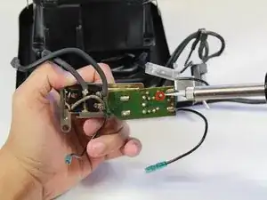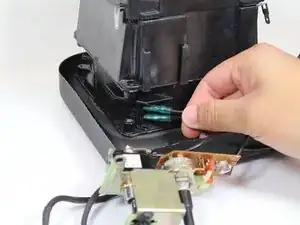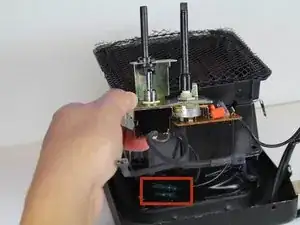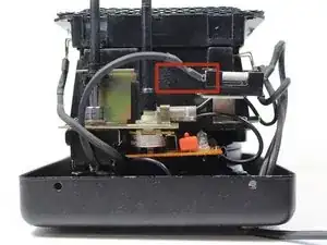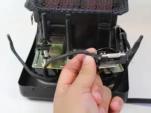 Отсоедините провод, идущий от нижней части кнопки питания к нагревательным спиралям. Чтобы отсоединить, потяните провод вниз, пока он не освободится.