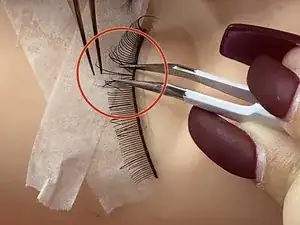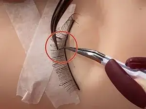 Удерживайте натуральную ресницу одним чистым пинцетом, а наращённую ресницу — другим чистым пинцетом.