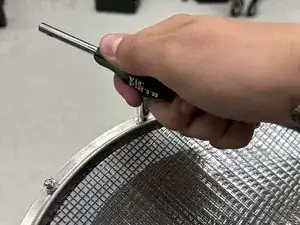 С помощью ключа для сильного натяжения ослабляйте натяжные винты на нижнем ободе по одному, медленно, по звёздной схеме, пока все винты полностью не будут сняты.