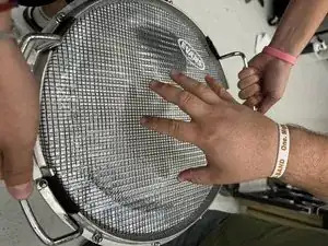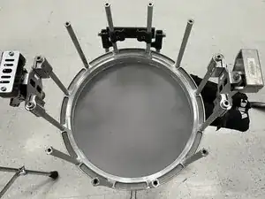 Установите новую мембрану на корпус, затем верните обод поверх неё, совместив натяжные винты с отверстиями для винтов.