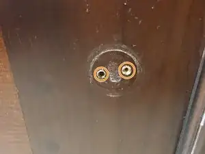 При помощи отвёртки или дрели закрепите резьбовую вставку в двери двумя винтами.
