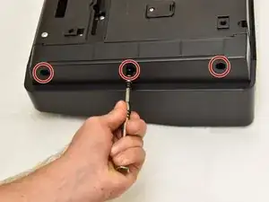 Снимите три серебристых винта 10 мм с J-образной головкой с помощью отвёртки J1 в нижней части внутренней боковой панели устройства.