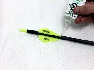 Снимите стрелу с приспособления и нанесите небольшую каплю клея вверху и внизу нового пера.