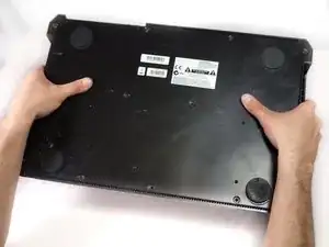 Переверните устройство. Отверткой Philips №2 удалите четырнадцать чёрных винтов длиной 10,3 мм, удерживающих заднюю панель.