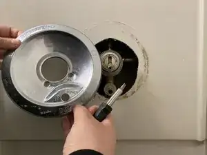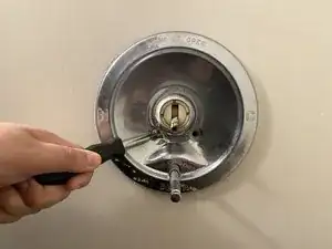Снимите декоративную крышку с ручки, поддев ее отверткой с плоским лезвием.