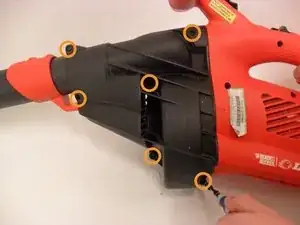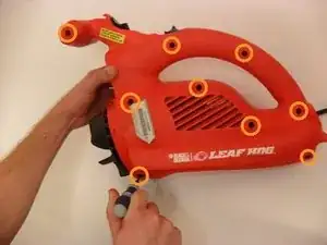 Руками снимите половину оранжевого корпуса, повернув винты к себе.