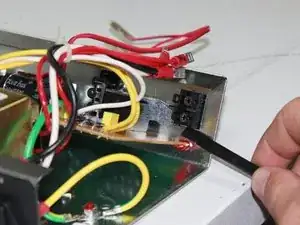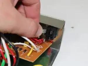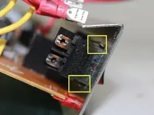 Две чёрные проводки подключают верхнюю крепёжную скобу к блоку реверберации в нижней части устройства. Пометьте провода, чтобы не перепутать при установке, затем отсоедините их от блока реверберации.