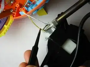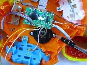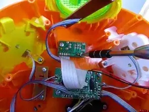 Удалите мотор, подняв его из корпуса, и найдите присоединенные провода на обоих концах: на плате и самом моторе. Используйте паяльник, чтобы удалить существующие соединения, прогревая паяное соединение концом паяльника, подтягивая провод.