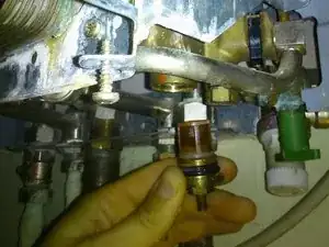 Перед тем как собрать все обратно, проверьте, движется ли вертикальный вал в блоке переключателя воды вверх, когда Вы открываете кран горячей воды.