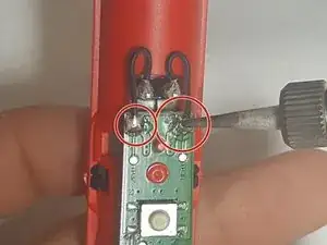 Удалите внутренний электронный механизм из корпуса, поддев красные зажимы, показанные на рисунке. Это удалит зарядный порт.