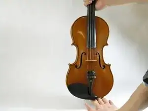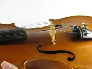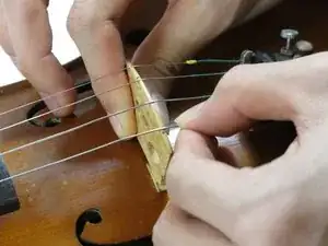 Держите подставку одной рукой и затягивайте струны в обратном порядке: сначала ля и ре, затем ми и соль. Затягивайте до приблизительного стандартного звучания каждой струны (рекомендуется тюнер для скрипки).