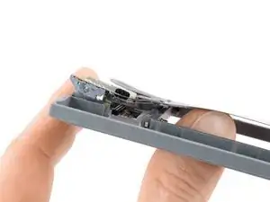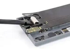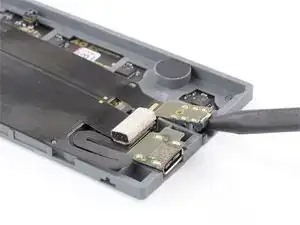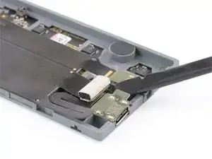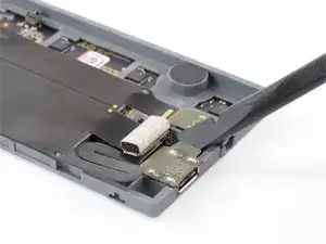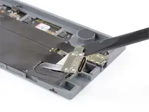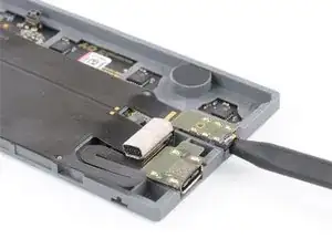 Медленно подденьте разъём USB-C из его гнезда. Используйте плоский конец лопатки на маленьком выступе на плате USB-C.