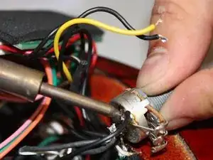 Используйте паяльник, чтобы распаять чёрный, жёлтый и белый провода от боковой части потенциометра.