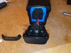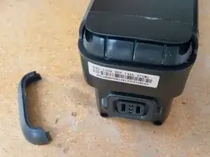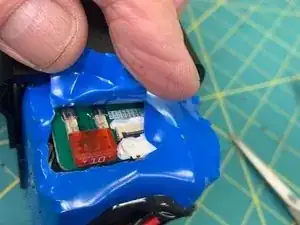 Предохранитель расположен в верхнем левом углу со стороны разъёма зарядки аккумулятора. Немного вытяните синюю оболочку, чтобы получить к нему доступ. Если вокруг аккумулятора много чёрной резиновой уплотнительной прокладки, возможно, потребуется открыть другую сторону, чтобы можно было выдавить аккумулятор с одного конца. Ваша цель — сделать так, чтобы верхняя часть аккумулятора выступала вверх, обеспечив доступ к предохранителю.