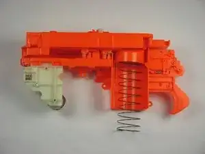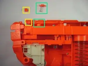 Перед сборкой убедитесь, что оранжевый блок, пружина и крепление магазина установлены на свои места.