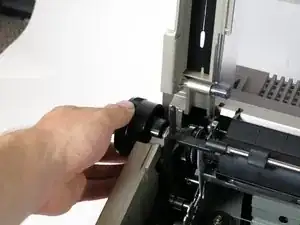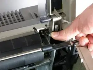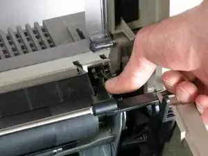 Переведите пластиковую защёлку на правой стороне ролика подачи бумаги, чтобы разблокировать фиксатор бумаги.