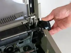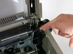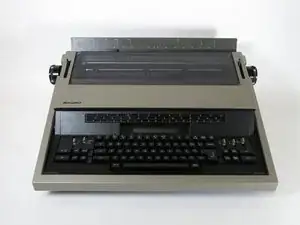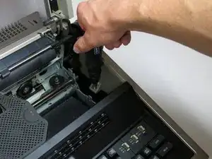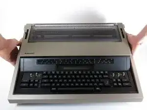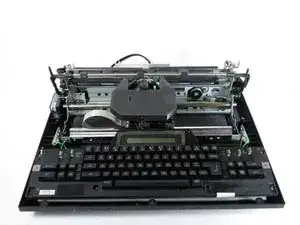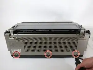 Откройте крышку пишущей машинки и сдвиньте каретку в сторону, чтобы открыть доступ к двум винтам, крепящим корпус к шасси.