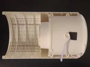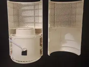 Теперь у нас есть внешняя оболочка фильтра. Чтобы разделить её, найдите защёлки, которые удерживают половины корпуса очистителя вместе.