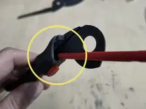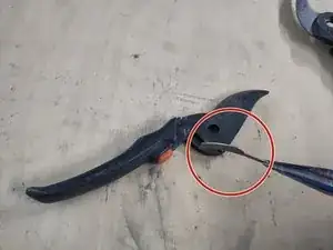 Держите ножницы в тисках и открутите болт T30, соединяющий два лезвия.