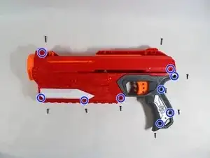 На той же стороне удалите все 9 винтов с корпуса бластера, как показано на изображении.