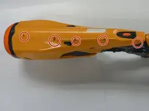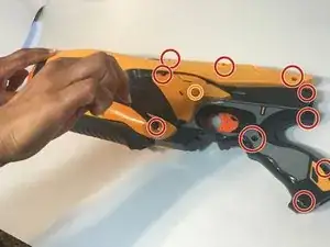 Положите бластер на бок с ручкой справа и ослабьте все винты, чтобы можно было открыть корпус. (Не все винты видны на предоставленных фотографиях.)