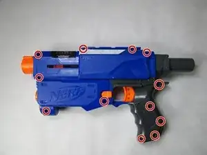 Снимите одиннадцать шурупов длиной 8 мм и два шурупа длиной 10 мм с левой стороны бластера, и осторожно снимите внешнюю оболочку.