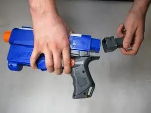 Извлеките магазин из бластера, продвигая механизм скольжения назад, нажимая оранжевые вкладки вниз и вынимая магазин.