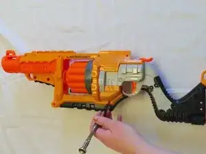 Аккуратно соберите NERF Lawbringer в обратном порядке. Тщательно закрепите три винта, герметизирующие воздушную камеру.