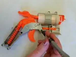 Выверните три винта, крепящие спусковой механизм пушки.