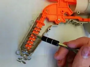 Замена пружины в бластере NERF Doomlands 2169 Lawbringer — задача средней сложности, занимающая от пятнадцати до тридцати минут. Для выполнения ремонта специальных навыков не требуется. Основная пружина отвечает за выталкивание плунжера вперёд при выстреле и удержание плунжера в заднем положении при взводе пушки. Основную пружину следует заменить, если устройство теряет эффективность.