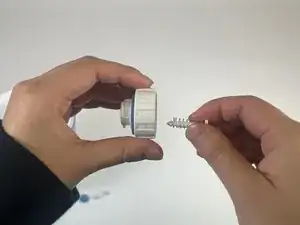 Через центр крышки проходит белый пластиковый стержень. На одном конце у него плоская круглая поверхность, на другом — заострённый конец. На заострённом конце расположено небольшое синее силиконовое кольцо.