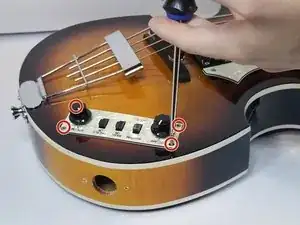 При помощи отвёртки Phillips #1 снимите панель разъема с нижнего угла гитары.