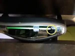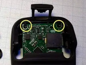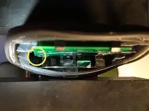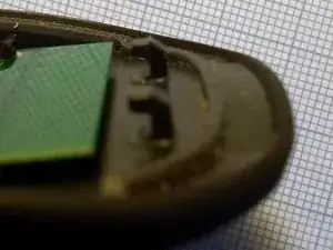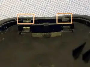 Если заглянуть внутрь открытой передней части, можно различить два треугольных зажима, расположенных в жёлтых кругах. Эти зажимы удерживают блок шарнира на плате.