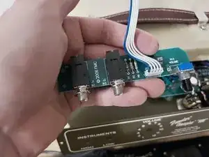 Отключите панель, на которой расположены входные разъёмы и наш регулятор громкости. Для этого можно использовать пальцы или экстрактор для микросхем/инструмент для съёма разъёмов.