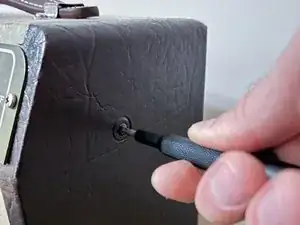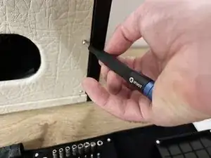 Далее снимите ручку громкости — для этого вам понадобится шлицевая насадка 2.5 мм. Аккуратно вставьте насадку в отверстие на задней стороне ручки, чтобы открутить небольшой винт внутри неё.
