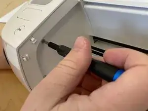 Найдите винты, крепящие шарнир передней двери к нижней пластине Cricut.