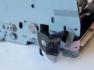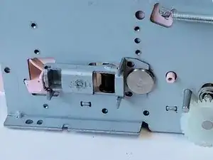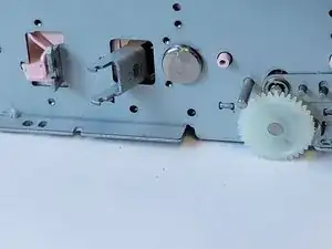 Под мотором находится белая пластиковая шестерня. Чтобы снять её, аккуратно потяните её с оси.
